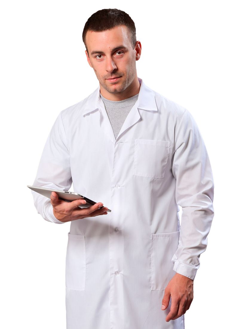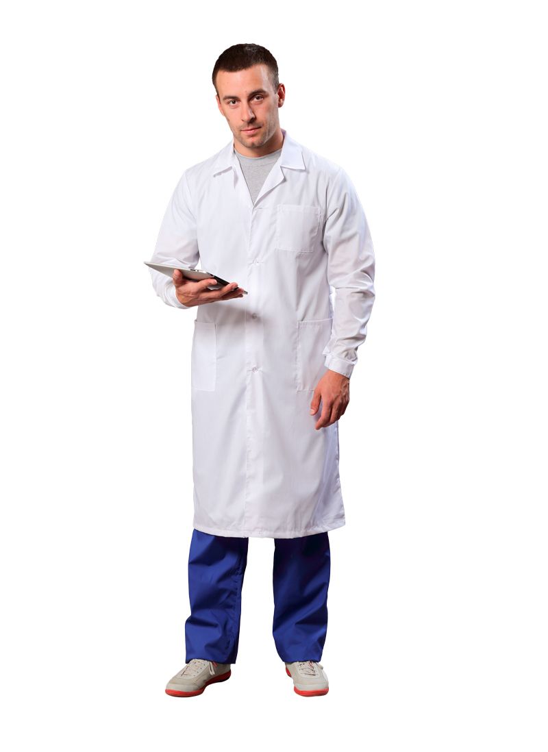 Халат с центральной бортовой застежкой на пуговицы. С одним нагрудным накладным и двумя нижними карманами. Спинка со средним швом, с поясом, втачанным в боковые швы.