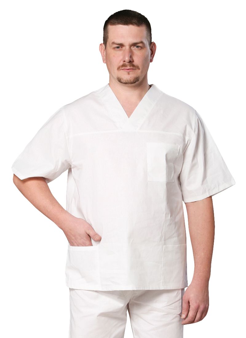 Рубашка с V-образной горловиной, обработанная отделочной обтачкой. Передняя часть с отрезной кокеткой, с одним верхним и двумя нижними накладными карманами. Нижние карманы входят в боковые швы. Рукава втачные одношовные, короткие.