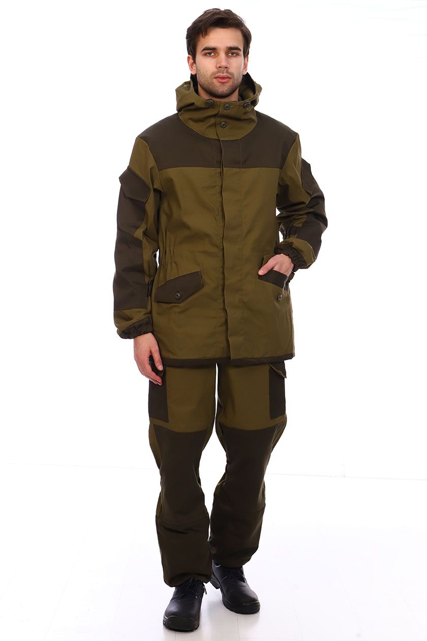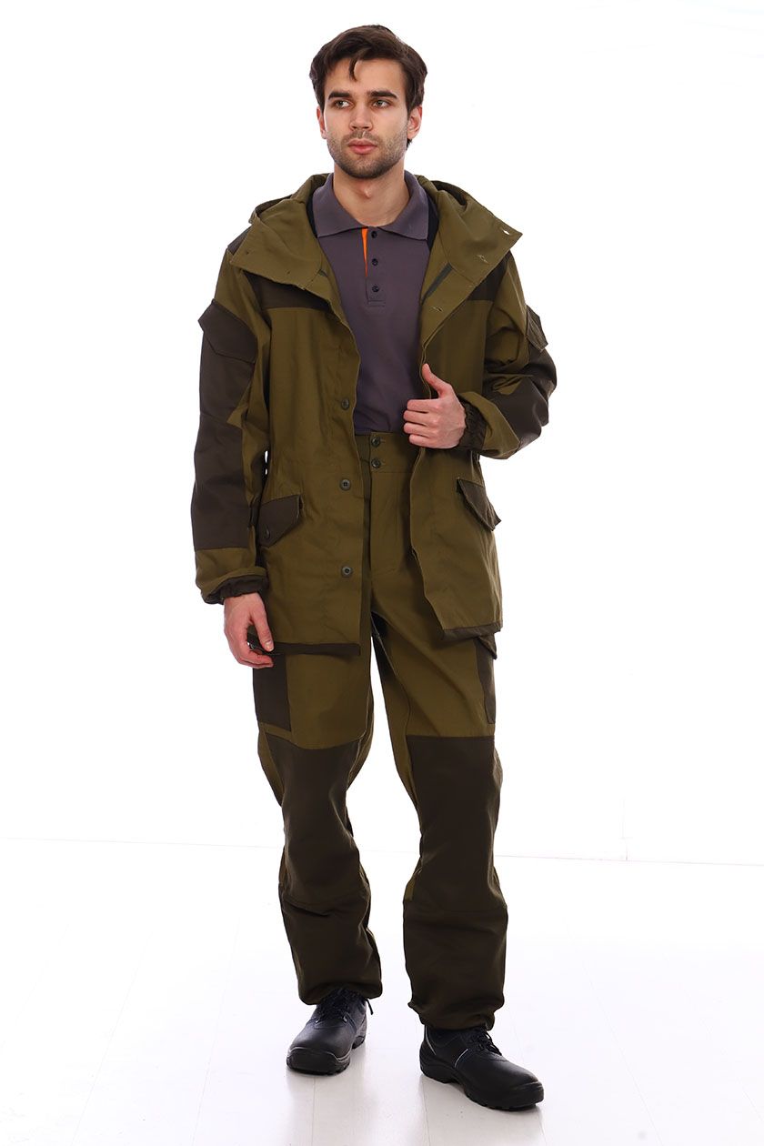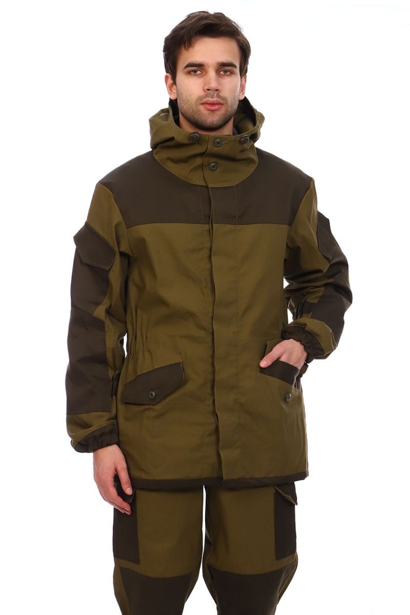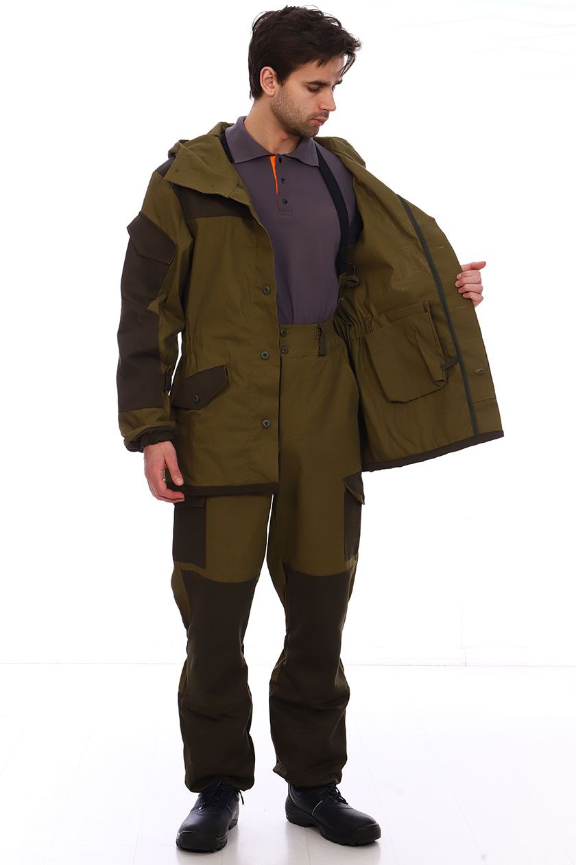➠ Куртка прямого кроя, с супатной бортовой застежкой на пуговицы и капюшоном пристегивающимся на пуговицы. На полочках наклонные прорезные карманы с клапаном застегиваются на пуговицы. По линии талии расположена кулиса собранные на эластичную ленту. Рукава с налокотниками, над которыми расположены накладные карманы с клапанами фиксирующиеся на контактную ленту, с манжетами. Карман на внутренней подкладке левой полочки.